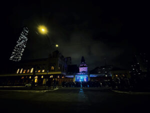O processo culminou na criação da obra visual “Corpo Território: margens presentes” apresentada em videomapping sobre a face oeste da torre do relógio da Estação da Luz, durante o encerramento do Festival Cultura e Pop Rua 2025. A exibição contou com um público expressivo que assistiu à peça artística em looping por 2 horas. Testemunhar o prédio histórico iluminado por narrativas visuais construídas pelos residentes foi, simultaneamente, um gesto artístico e político: a língua (as línguas?) e as linguagens ocupando um espaço simbólico e exibindo para a cidade, a partir do farol que é o relógio da estação da Luz, o que a rua diz.